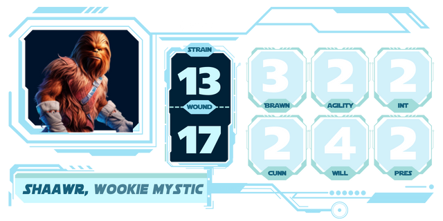Shaawr is a wookie. Born and raised on Kashyyyk, he is a firm believer in the Force and has allowed it to guide him for most of his life. His force sensitivity made him a natural candidate to one day lead his people, until being captured by slavers and sent far from his home. Eventually making a deal for his freedom, he's now coming to terms with life outside of captivity and trying to find the path the Force will lay out for him next.Shaawr is played by Bear. Bear enjoys sriracha sauce, wearing mittens, and letting Scarlett write his bio. Check out Bear's content at the links below, or open the PDF to view Shaawr's character sheet.